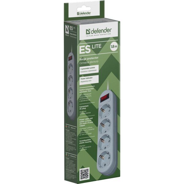 Мережевий фільтр Defender ES Lite початкового рівня із чотирма розетками, що забезпечує всі базові функції захисту електротехніки. Надійний захист від перевантаження по струму, короткого замикання, ВЧ та імпульсних перешкод. Автоматичний запобіжник, вбудований у вимикач. Силовий кабель і контакти розеток виконані із чистої міді. Індикатор стану під*єднання до мережі. Корпус зроблений з негорючого пластику.