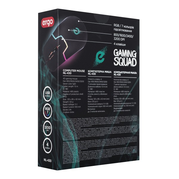 Маніпулятор ERGO NL-430 виготовлений з міцного та приємного на дотик ABS пластику, оснащений оптичним сенсором та під*єднується до комп*ютера за допомогою USB-кабелю. Кнопки миші розраховані на 10 мільйонів натискань, чого достатньо для найінтенсивніших боїв у будь-якій грі. Мишка має розмір 125 x 85 x 42 мм, вона зручно розміститься на ігровому столі та прослужить максимально довго.