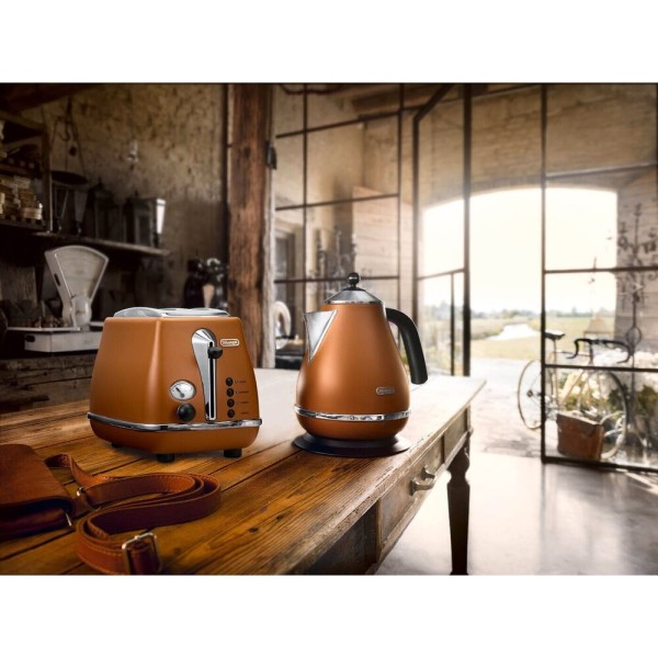 Чайник DeLonghi KBOV 2001 BW має металевий корпус, забарвлений у яскравий коричневий колір. Дизайн приладу виконаний у ретро-стилі, як і вся дизайнерська колекція «Icona Vintage». Ви можете купити цей чайник і насолоджуватися його швидкою роботою, яка забезпечується високою робочою потужністю пристрою 2000 Вт.
