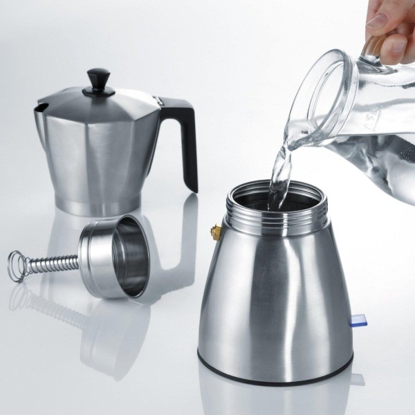 Что она приготовит его быстрее, что поспособствует экономии электроэнергии. В комплекте с данной кофеваркой идет 2 фильтра из нержавеющей стали – благодаря им вы можете приготовить за 1 раз от 3 до 6 чашек вкусного, бодрящего напитка, что соответствует 150 и 300 мл.
