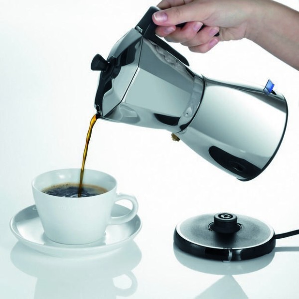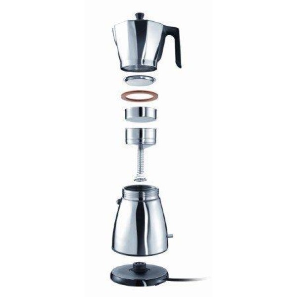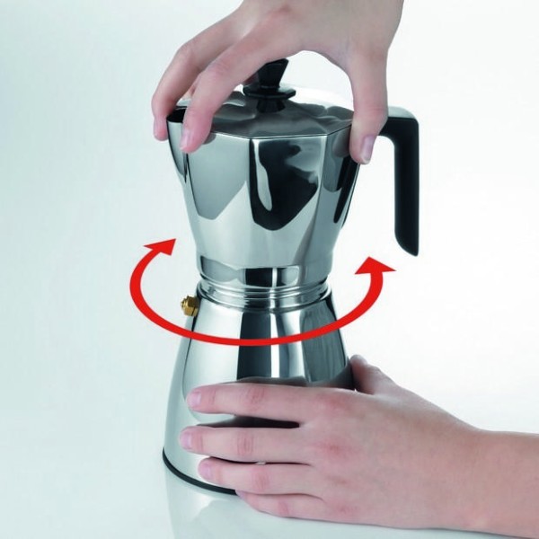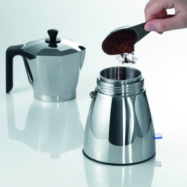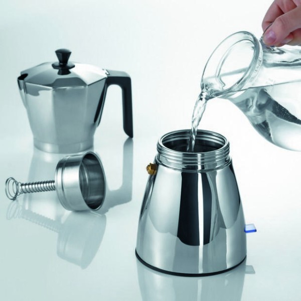 На контейнері для води є спеціальний клапан-запобіжник, а завдяки центральному контакту ви можете повертати її навколо своєї осі. Вона комплектується двома знімними фільтрами з харчової нержавіючої сталі, завдяки яким ви можете приготувати каву на 3 або 6 персон за один раз.