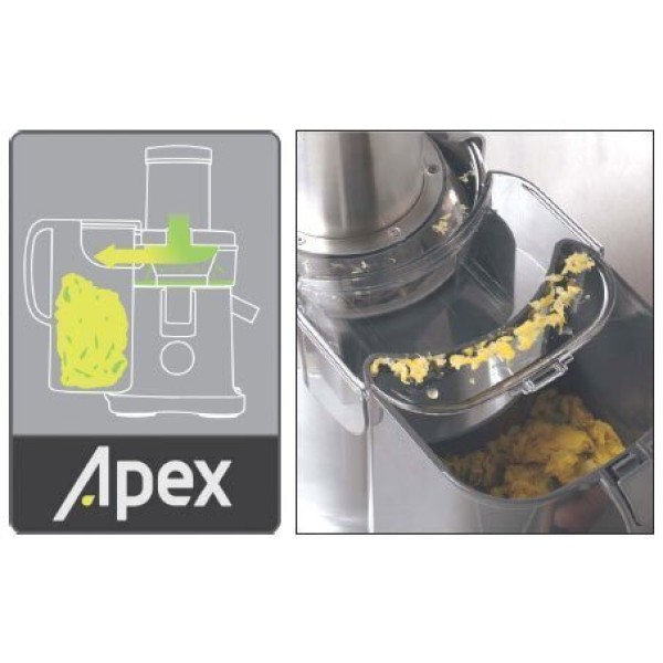 Технологія APEX дозволяє максимально очищати сік від макухи, залишаючи сито чистим. Це гарантує якісний віджимання при тривалій роботі. Червона кнопка на корпусі припиняє роботу приладу. Дана модель оснащена системою крапля-стоп, завдяки якій сік прямує саме в глечик без розбризкувань. Купити такий прилад на кухню – це тішити себе та своїх близьких по-справжньому якісними корисними соками.