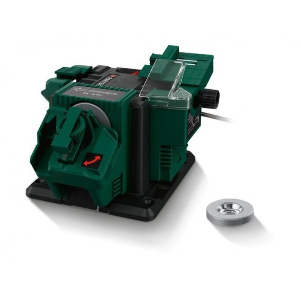 3 різні вкладення: 1 кріплення для заточування ножів, ножиць та лез 1 кріплення для заточування свердлильних свердлів Ø 3-10 мм 1 магнітне кріплення для заточування зубил шириною 6-51 мм.