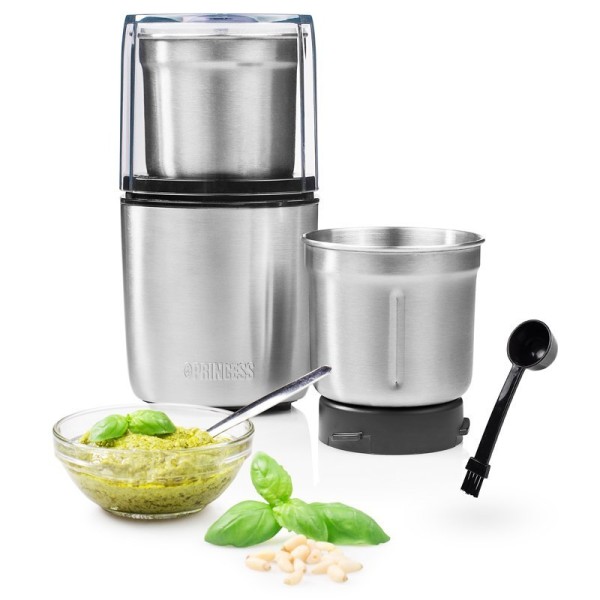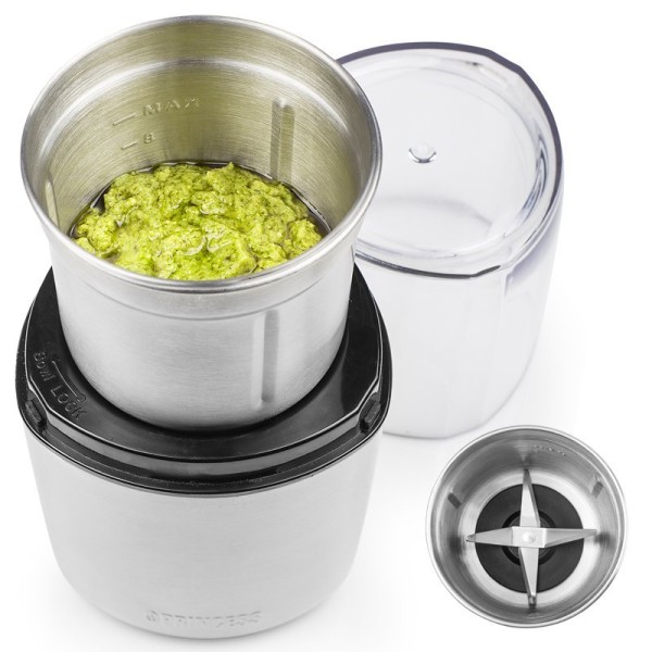 2 в 1 - подрібнювач з двома знімними чашками і спеціальними лезами для вологого і сухого подрібнення • У корпусі з нержавіючої сталі з кришкою, для зручності включається натисканням зверху • Ідеально підходить для сухих продуктів, таких як горіхи і кавові зерна і вологих продуктів, таких , як помідори і песто