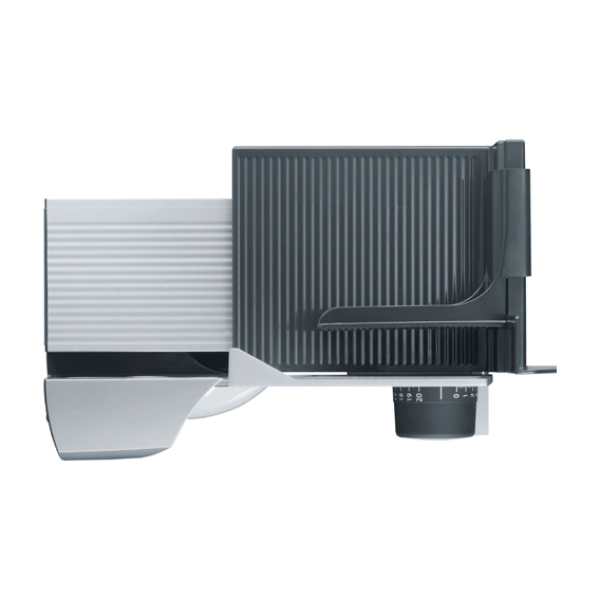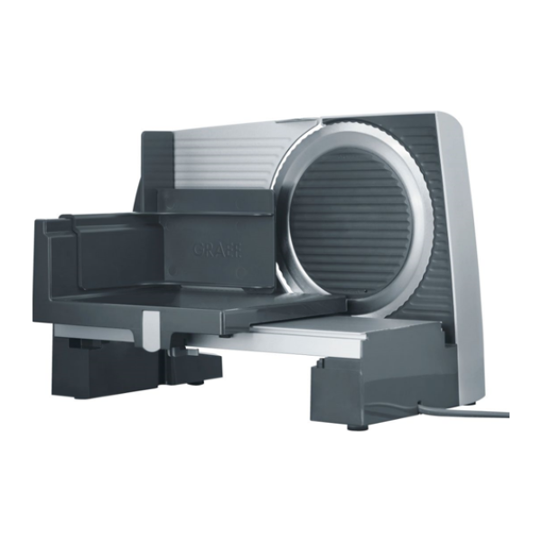 Зазубрене лезо з нерж. сталі з обмежувачем для безпеки використання та заміни леза: ідеально для нарізування хліба, ковбас, сирів. Має оптимальні результати нарізування. Оснащена кареткою з плавним ходом та захистом від дітей. Є відсік для мережного кабелю.
