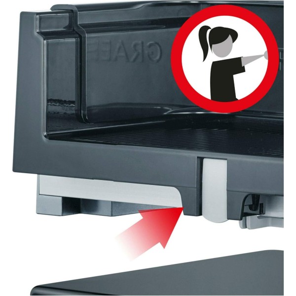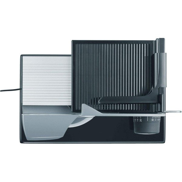 Компактний металевий слайсер для дома GRAEF SKS11120 з опорною підставкою, що дозволяє нарізати продукти відразу в ємність для запікання або великий посуд без обмежень у площі. Простий у використанні. Гладке лезо з нержавіючої сталі Ø 170 мм – краще подолає надтонкі скибочки, не пошкоджуючи волокна м'яса – ідеально для нарізки шинки та карпаччо, а також підходить до м'яких продуктів. Зазубрене лезо з нержавіючої сталі для нарізування продуктів із твердою скоринкою.