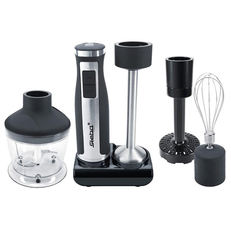 • Потужність: 700 Вт • Тип: занурювальний • Кількість швидкостей: 8 • Ємність склянки (мл): 800 • Міні-подрібнювач: немає • Матеріал ніжки блендера: Метал • Кількість обертів на хвилину: 7000-14000 • Насадки: Віночок для збивання, для терки, шинкування, Насадка для пюре • Особливості: Деталі можна мити в посудомийній машині, Прогумований корпус, Контейнер для зберігання ножів • Колір: Чорний, Металик •