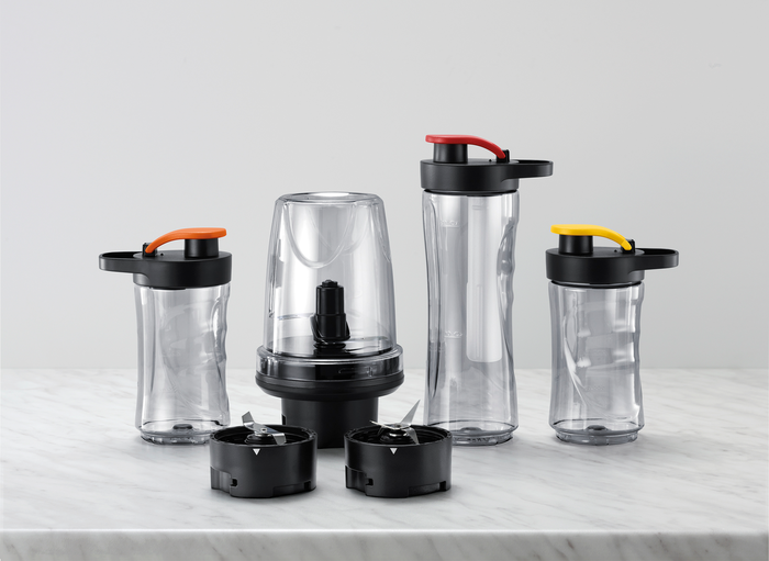 Відкривайте нові можливості з різноманітними аксесуарами: пляшка ємністю 600 мл з паличкою, що охолоджує, і кришкою з ручкою, 2 пляшки ємністю по 300 мл з кришкою з ручкою, подрібнювач, кавомолка.