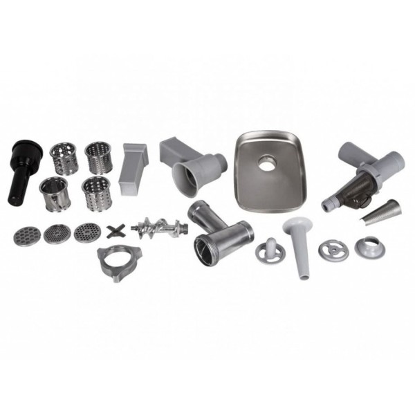 У комплекті є насадка для кеббе, для драників, для томатів та ягід, для ковбасок, а також терка-ломтерізка.