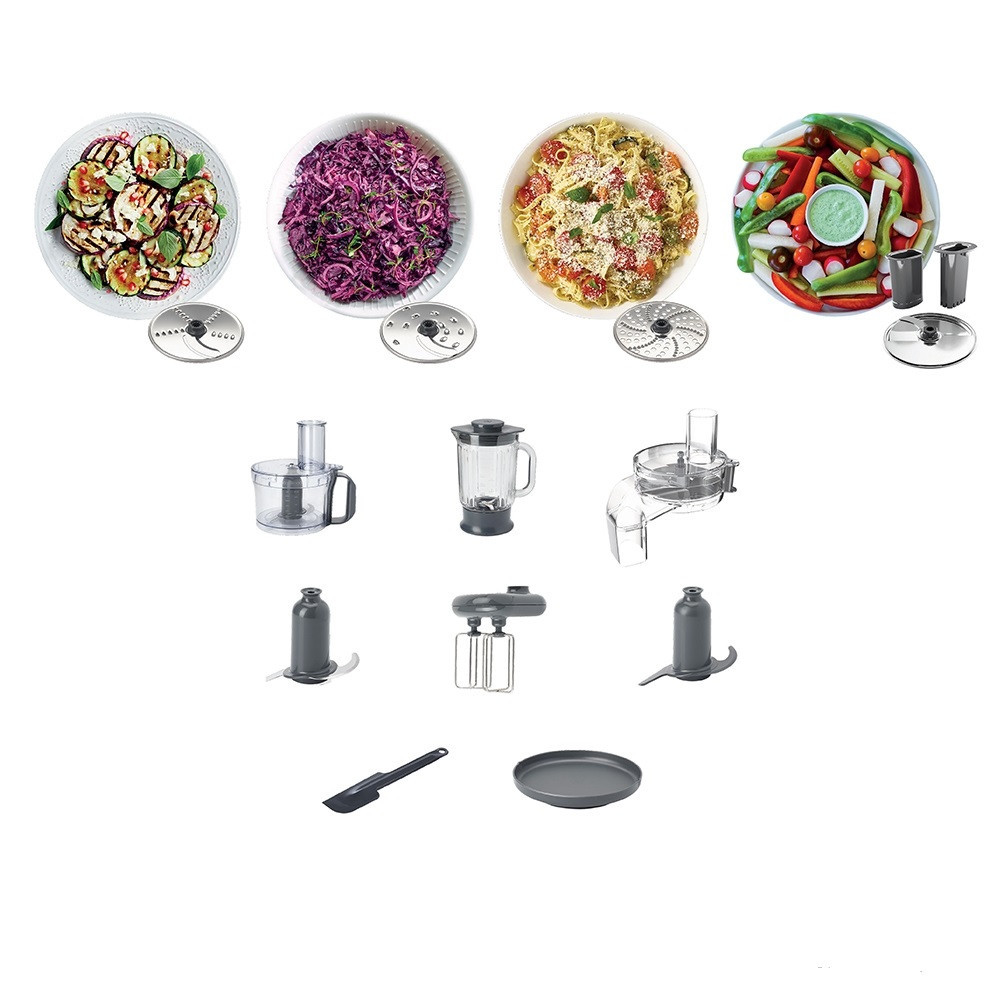 У комплектацію входить: скляний блендер на 1,2 л; насадка експрес подачі (Express Serve) з додатковим диском для нарізування кубиками (Express Dice); ніж-подрібнювач; насадка для замісу тіста; подвійний віночок; 3 диски для шатківниці (2 мм, 4 мм, екстра дрібний), силіконова лопатка, лоток для зважування.
