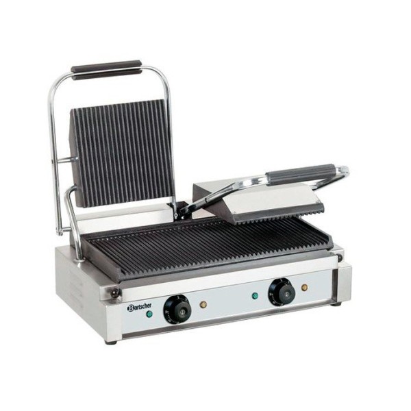Прижимные плоскости электрического гриля Bartscher A150671 рифленые и изготовлены из чугуна, Верхняя и нижняя поверхность гриля разогреваются одновременно.