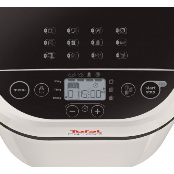 Хлібопічка Tefal Pain Dore PF210138 пропонує 12 автоматичних програм. Серед них програми для хлібної випічки та додаткові програми, що дозволяють готувати в цьому апараті ще й джем, каші, крупи. Крім базових і очікуваних сортів хліба (класичний, житній, французький) присутній режим для хліба без глютену, 2 режими швидкої випічки. Особливо порадує господинь режим замісу дріжджового тіста, який дозволить приготувати пельмені, піцу, пиріжки з меншими зусиллями.