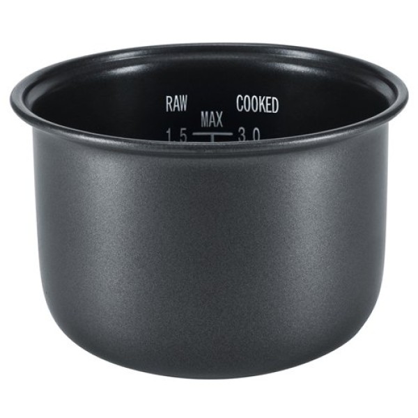 Съемная чаша с антипригарным покрытием объемом 0.9 литра. Крышка с замком и отверстием для выхода пара. Автоматическое поддержание тепла после приготовления. Контрольные лампы режима приготовления и сохранения тепла. Мерный стакан и ложка для риса в комплекте