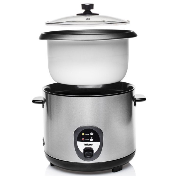 Рисоварка Tristar RK-6129 виконана з нержавіючої сталі. і термостійкого корпусу, допоможе вам без особливих зусиль приготувати будь-який рис. Вона оснащена лампою з вимикачем on/off, яка повідомить Вас про готовність продукту, а також має функцію підтримки температури, мірну склянку та ложку. Рисоварка має прозору знімну кришку оснащену отвором для випуску пари і має захист від перегріву.