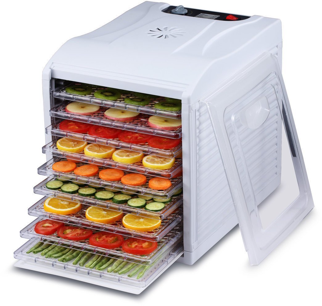 9 пластиковых лотков позволяют одновременно высушивать разные виды овощей, зелени, фруктов и даже мяса вместо многочасового процесса консервирования.