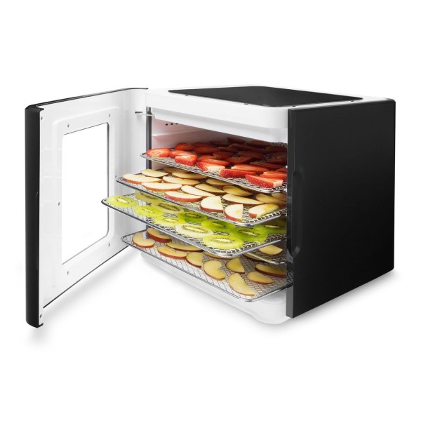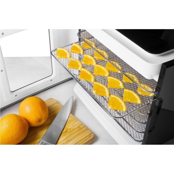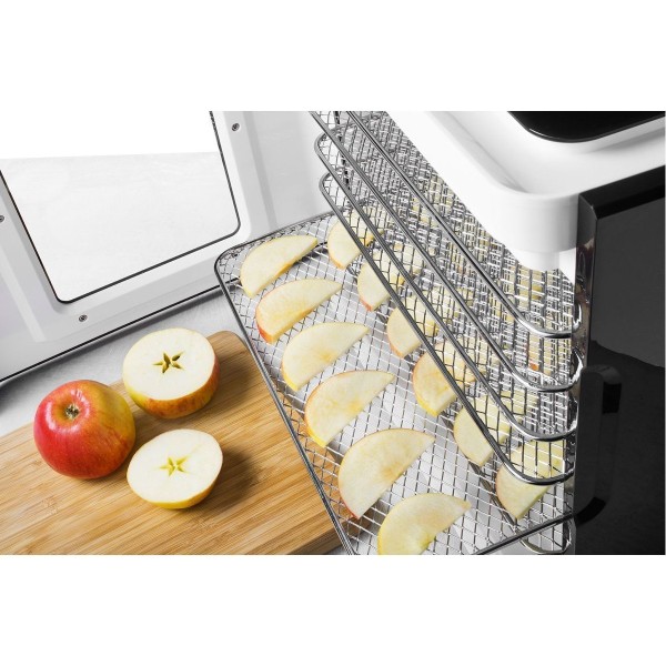 Завдяки горизонтальному потоку повітря температура однакова на всіх рівнях, і Вам не потрібно вовтузитися з переміщенням окремих тарілок у процесі зневоднення.