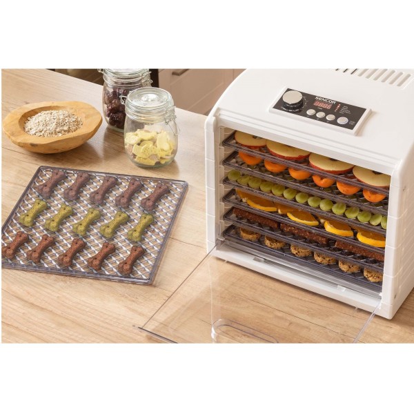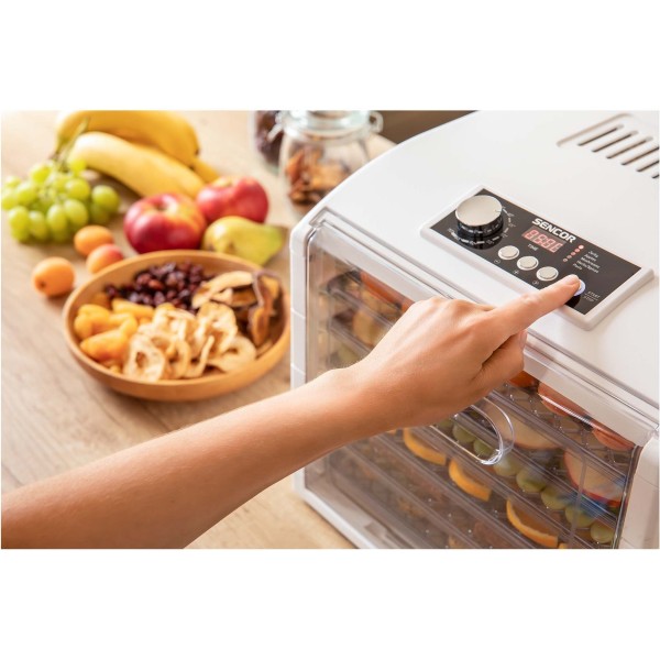 SENCOR SFD 6500WH призначена для приготування сухофруктів, родзинок, помідорів, трав і спецій, трав'яного чаю (м'ята, липовий колір, ромашка), квіткових пелюсток для ароматних сумішей, гарбузового насіння, грибів, суше.