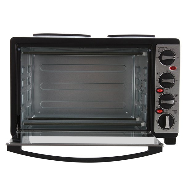 На верхній частині цієї електричної печі розташовані дві конфорки, на яких ви можете готувати як на звичайній плиті і супи, і крупи, і макаронні вироби, смажити на сковороді продукти і так далі.