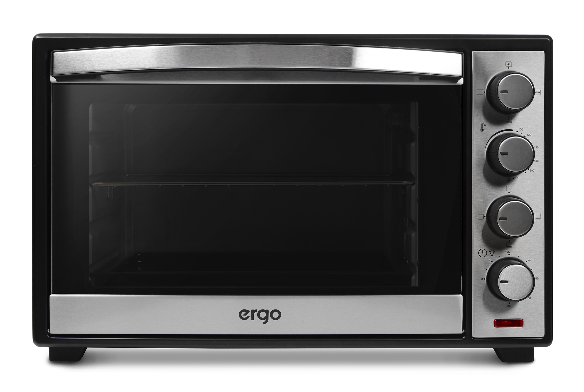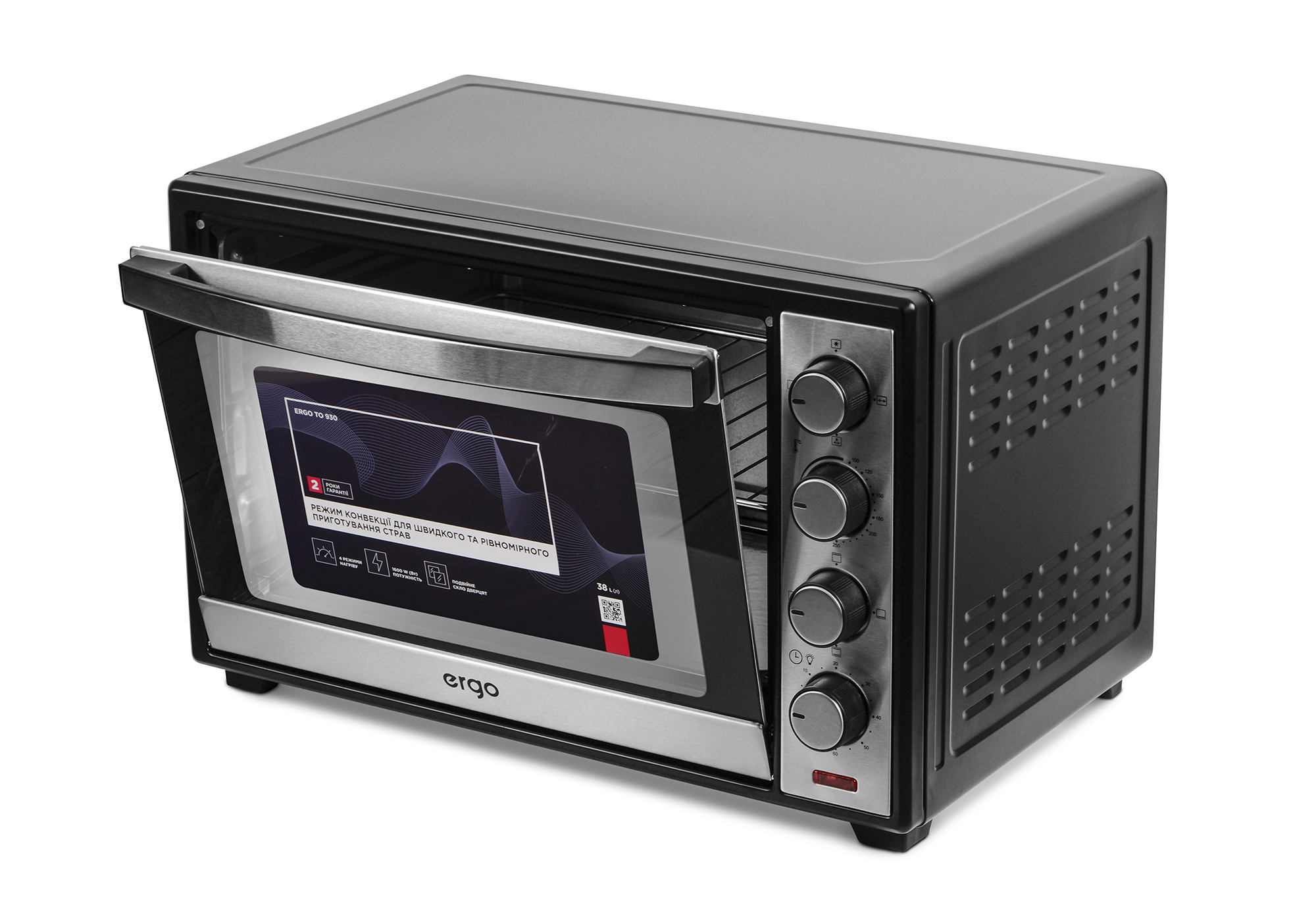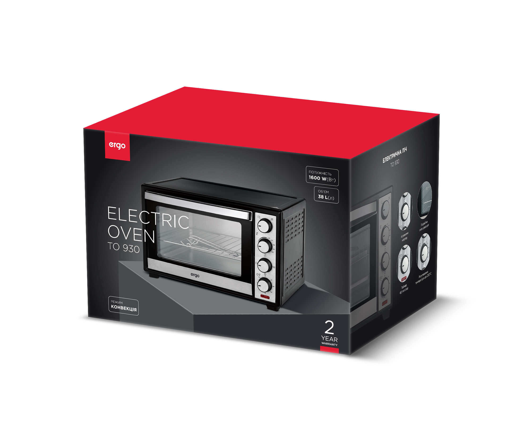 ERGO TO 930 – компактна, функціональна та стильна модель, яка завдяки вдалому поєднанню чорного кольорову й матової сталі прикрасить будь-який кухонний інтер’єр. Внутрішній простір, що має об’єм 38 літрів, поділено на декілька рівнів для зручності в користуванні й можливості готувати більшу кількість продуктів одночасно. Чотири ТЕНи дають максимальну потужність 1600 Вт, нагріваючи піч до 250°С.