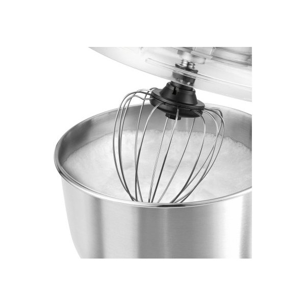 Плоский віночок А-подібної з полірованого металу, спіральний гачок для тесту та кулястий віночок допоможуть вам швидко та легко змішати, замісити та збити інгредієнти у кулінарні шедеври. І для ще більшої універсальності є спеціальна кришка для захисту від бризок.