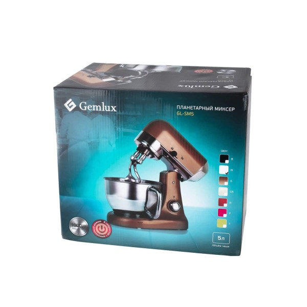 Настільний планетарний міксер Gemlux GL-SM5W призначений для замісу дріжджового та бездрожжевого тіста різної в'язкості, збивання яєць, вершків, кремів та мусів, приготування пюре, фаршу тощо. Устаткування має вісім швидкостей обертання мішалки та режим «пульс» (короткочасне включення на максимальну потужність). У комплект поставки входять: