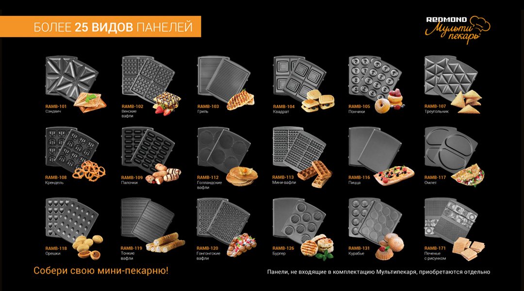 Чтобы готовить в мультипекаре другие блюда, например, пончики, фигурное печенье или печенье с рисунком, пряничный домик, крендели или экзотические гонконгские вафли, просто подберите подходящую панель из ассортимента REDMOND. Для мультипекарей PRO разработано уже более 25 комплектов сменных панелей, и выбор будет расширяться.