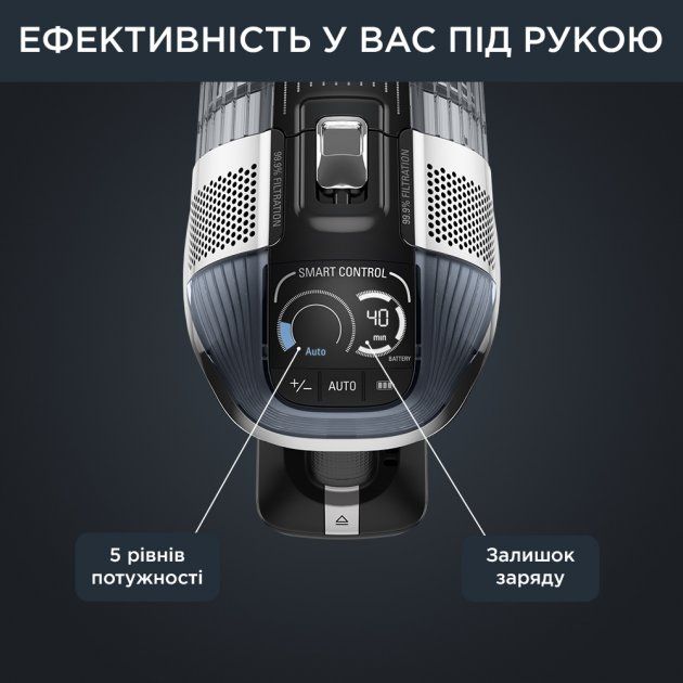Дисплей Smart Control показує залишок заряду батареї та сповіщує про необхідність очищення фільтра, а також дозволяє регулювати потужність відповідно до ваших потреб за допомогою 4 різних рівнів і режиму Boost.