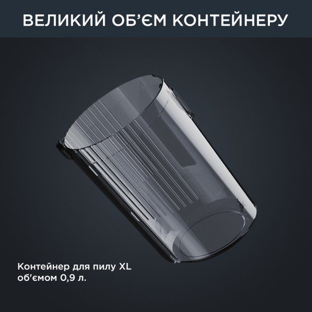 Насолоджуйтесь тривалими сеансами прибирання з контейнером для пилу XL об*ємом 0,9 л, який надзвичайно легко спорожнити та на 100% мити разом із сепаратором і фільтом.