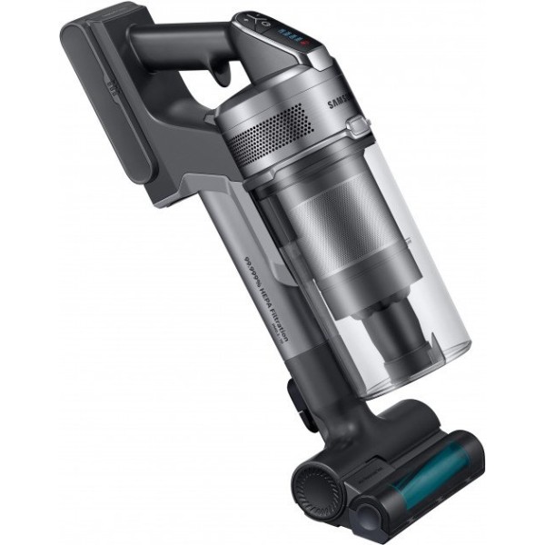 Акумуляторний пилосос Samsung VS20T7536T5/EV є портативним акумуляторним пристроєм, виготовленим в сучасному дизайні в сріблястому кольорі.