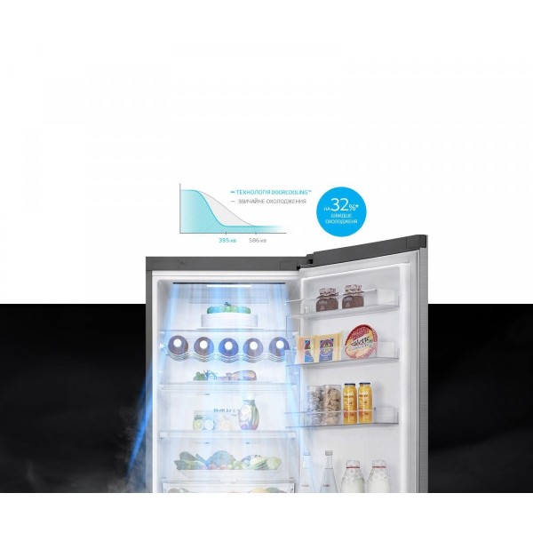 Инновационная система DoorCooling помогает увеличить скорость охлаждения во всех отсеках на 32%, что особенно важно для хранения овощей и фруктов в зоне свежести.