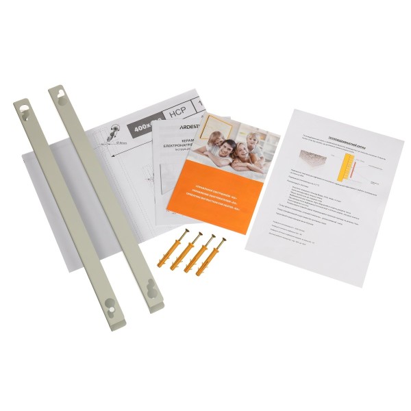 Для удобного монтажа обогревателя на стену предусмотрена инструкция со схемой переноса отверстий, теплоотражающий экран, крепления и кроншейн.