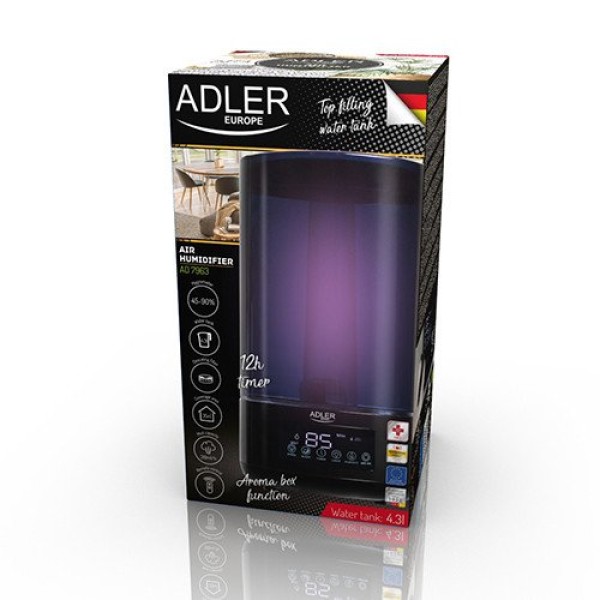 Зволожувач Adler AD 7963 комплектується ультразвуковим високочастотним генератором, розбиває воду на дрібні частинки діаметром 1-5 мікрометра.