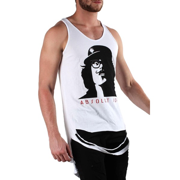 MADE IN ITALY: round collar, sleeveless, designer motif, ripped effect, wash at 30°.