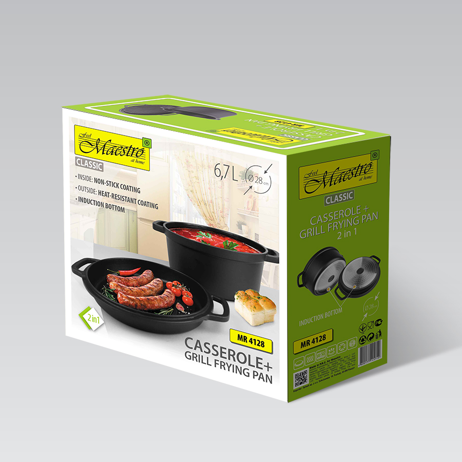 Каструля з кришкою сковородою гриль Maestro MR 4128 має діаметр 28 сантиметрів, корисний об'єм каструлі становить 6,7 літра, корпус каструлі та кришки-сковороди-гриль виготовлений з міцного литого алюмінію, з багатошаровим дном, що підходить для всіх типів джерел тепла.