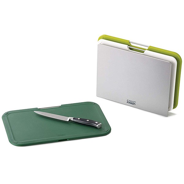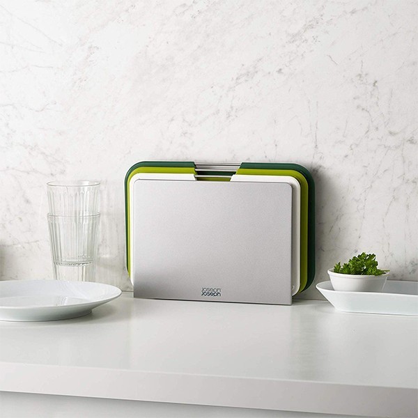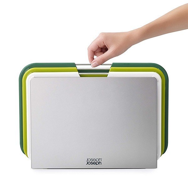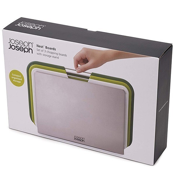Joseph Joseph Nest 60163 - набір із трьох обробних дощок з колірним кодуванням, дуже легко доступні та оснащені власною гладкою підставкою для зберігання, що робить набір стильним доповненням до будь-якої робочої поверхні. Кожна дошка має різний розмір, підходить для різних завдань з приготування їжі і має стрижень з нержавіючої сталі, що легко піднімається, нековзні ніжки і зручну для ножів текстуровану ріжучу поверхню. Підставка утримує кожну дошку окремо, дозволяючи циркулювати повітря для рівномірного висихання, і має нековзні ніжки на підставі.