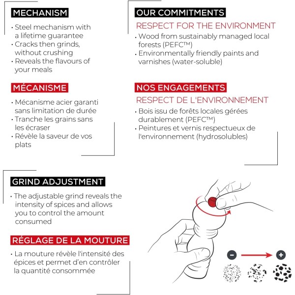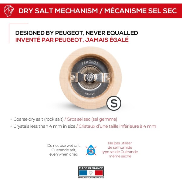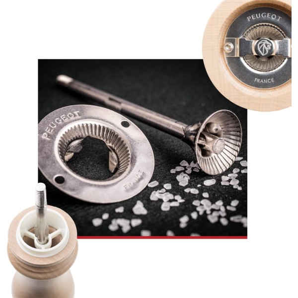 Млин для солі Peugeot Paris чудово впорається з подрібненням навіть найтвердіших кристалів морської чи кам'яної солі. Корпус млина виконаний із високоякісної деревини бука, вирощеного у Франції, та оброблений спеціальним матовим лаком для довговічності. Механізм з унікальною будовою лез з нержавіючої сталі покритий спеціальним запатентованим напиленням, що забезпечує довговічність, зносостійкість, стійкість до корозії, гостроту зубців. Виробник гарантує високу якість та міцність лез, на які дає більш ніж 10-річну гарантію.
