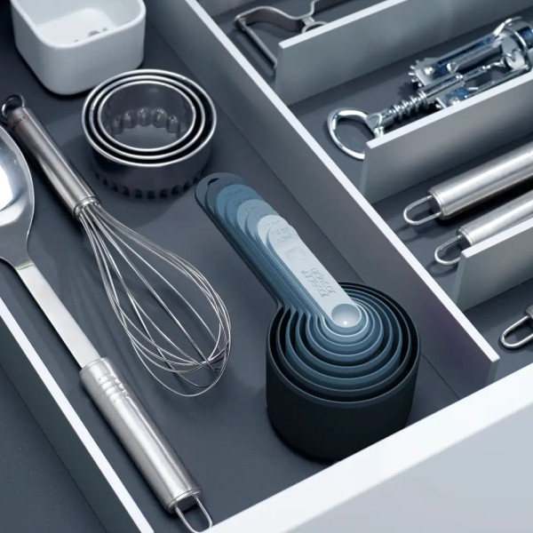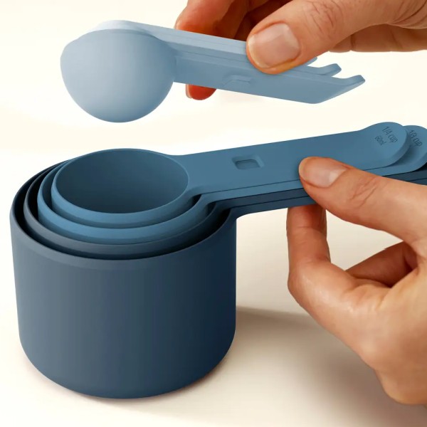 Інноваційний дизайн дозволяє зібрати всі елементи як «матрьошку», тим самим спрощуючи їх зберігання. Мірні ложки займають мінімум місця в кухонній шафці.