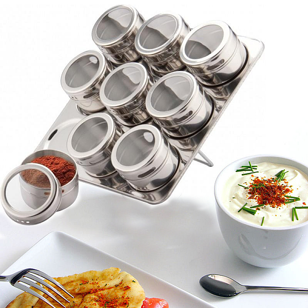 Набір Peterhof PH 12786 виготовлений із високоякісної харчової сталі, складається з ємностей, які на магнітах кріпляться на квадратну металеву підставку.