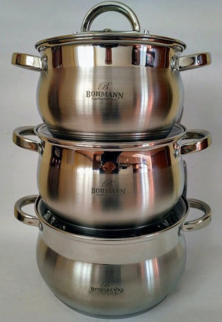 Набір каструль Bohmann BH 0526 складається з шести предметів — трьох каструль із нержавіючої сталі та трьох кришок із жароміцного скла.