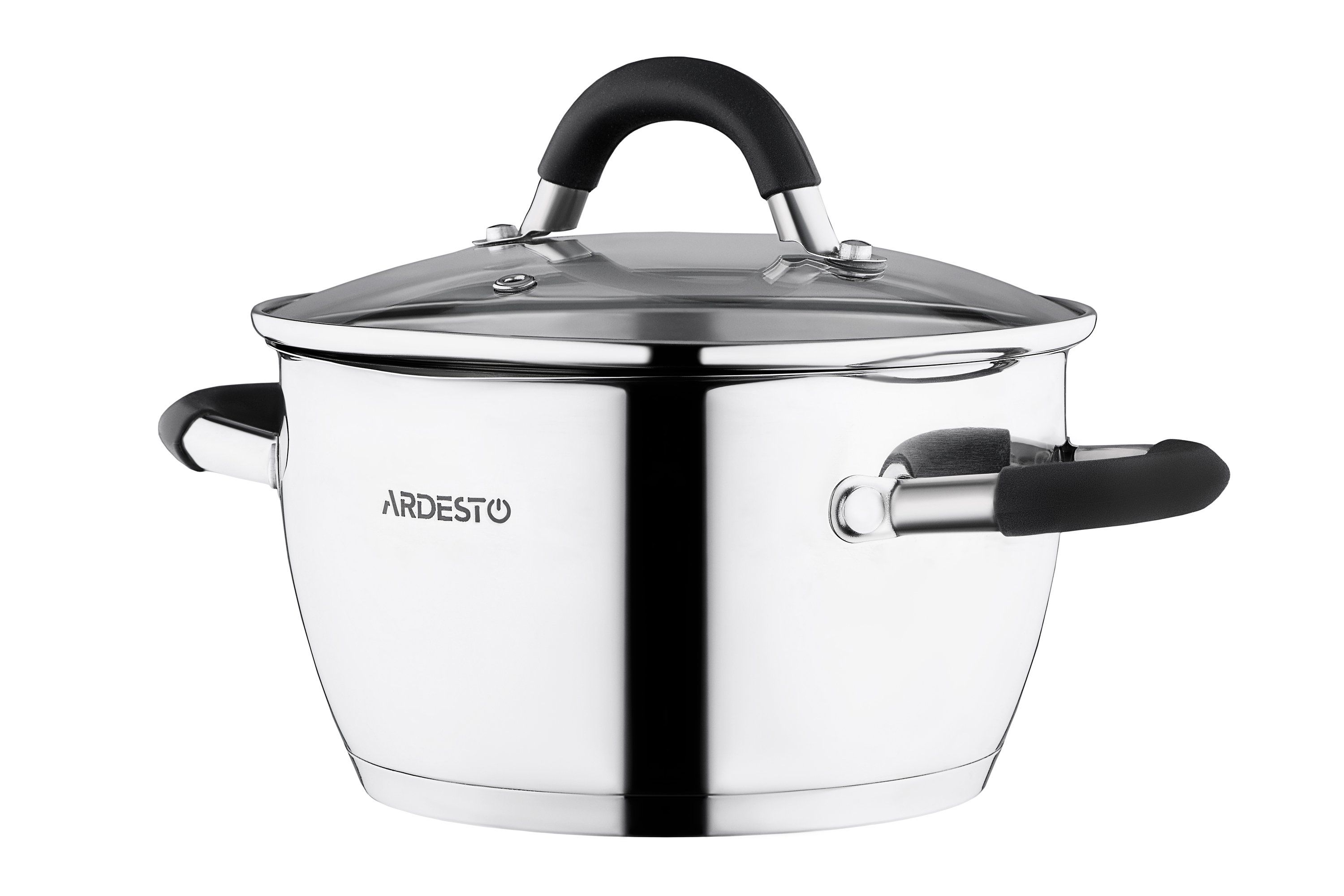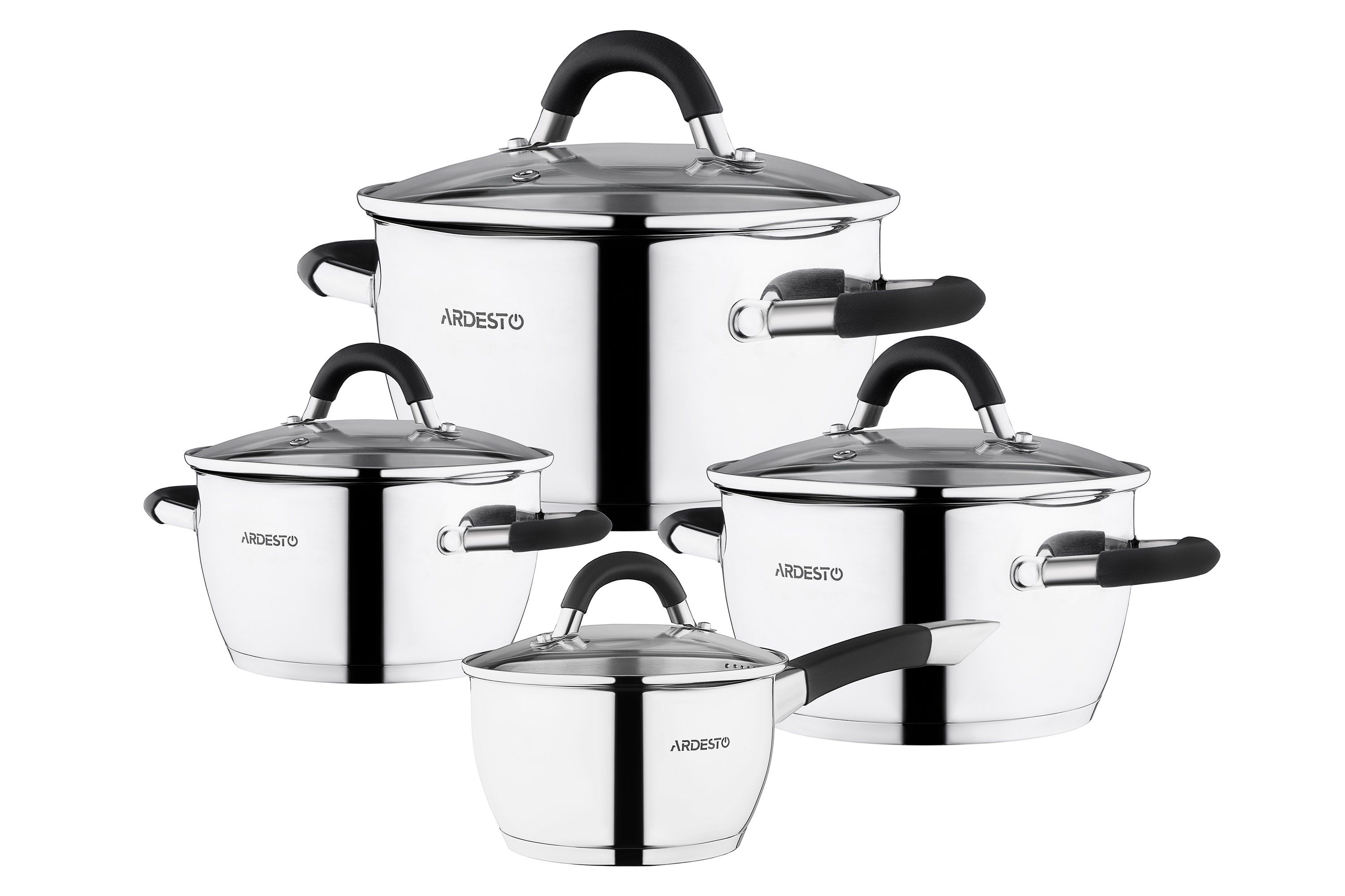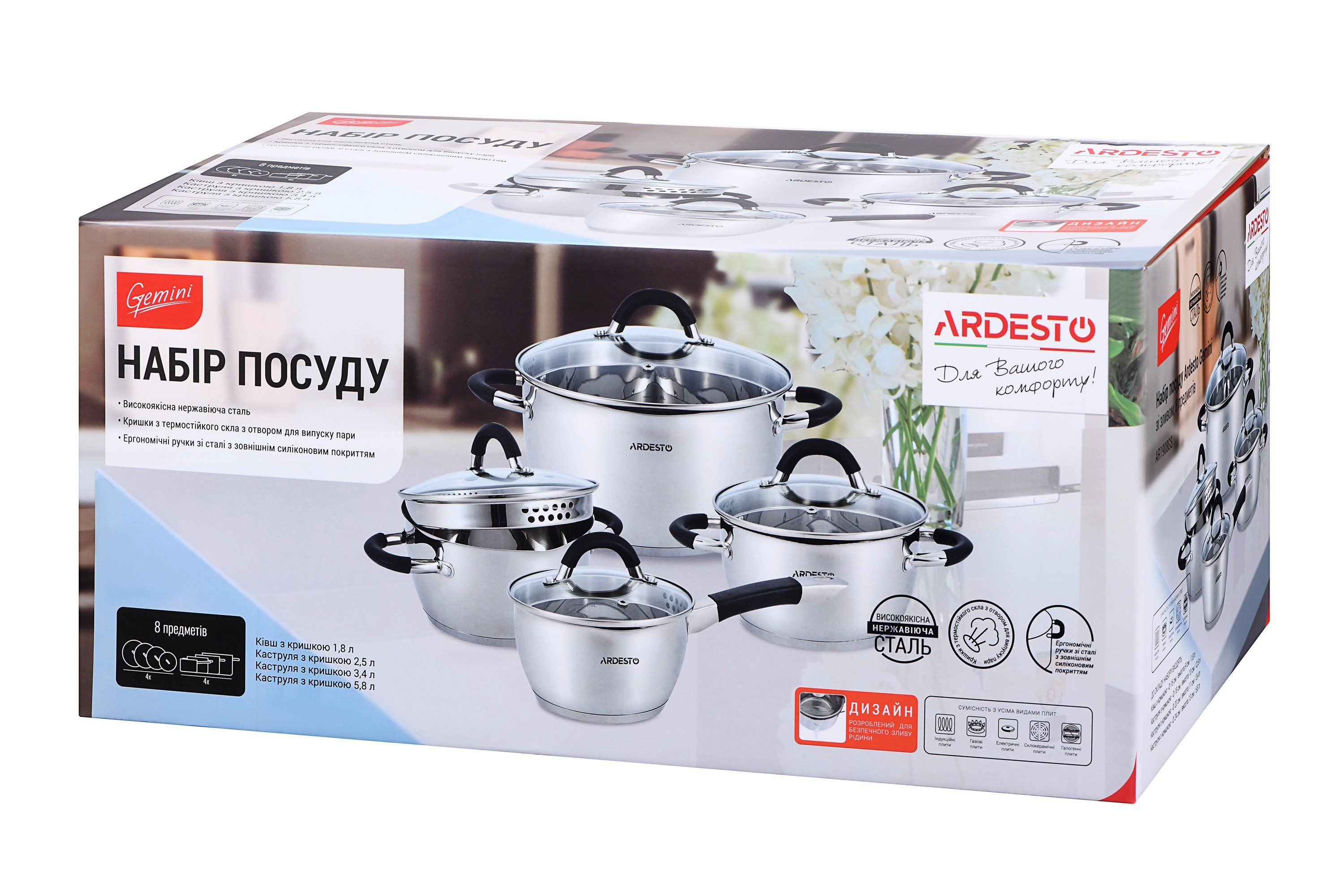 Набір посуду Ardesto Gemini Livorno зі зливом, 8 пред., ручки з сірим силіконом, нержавіюча сталь
