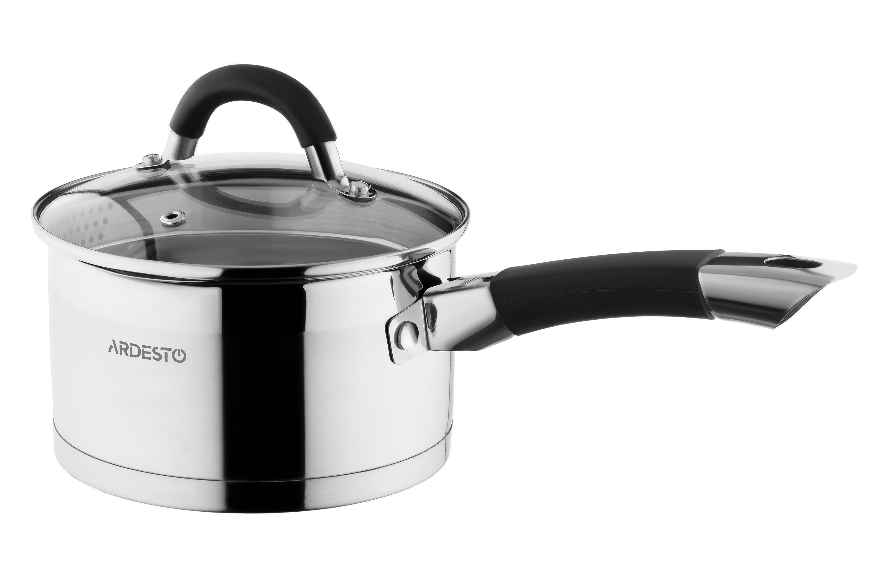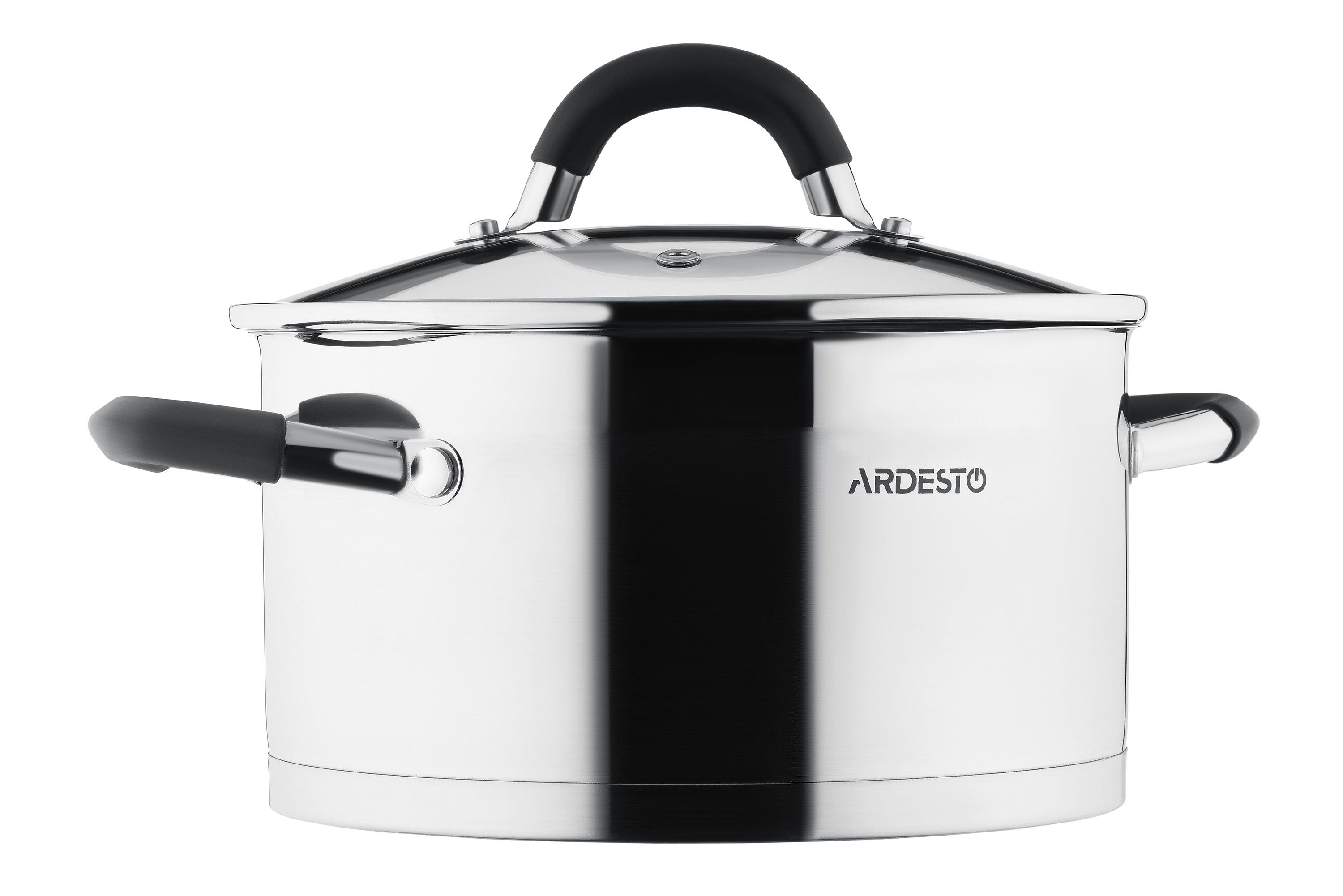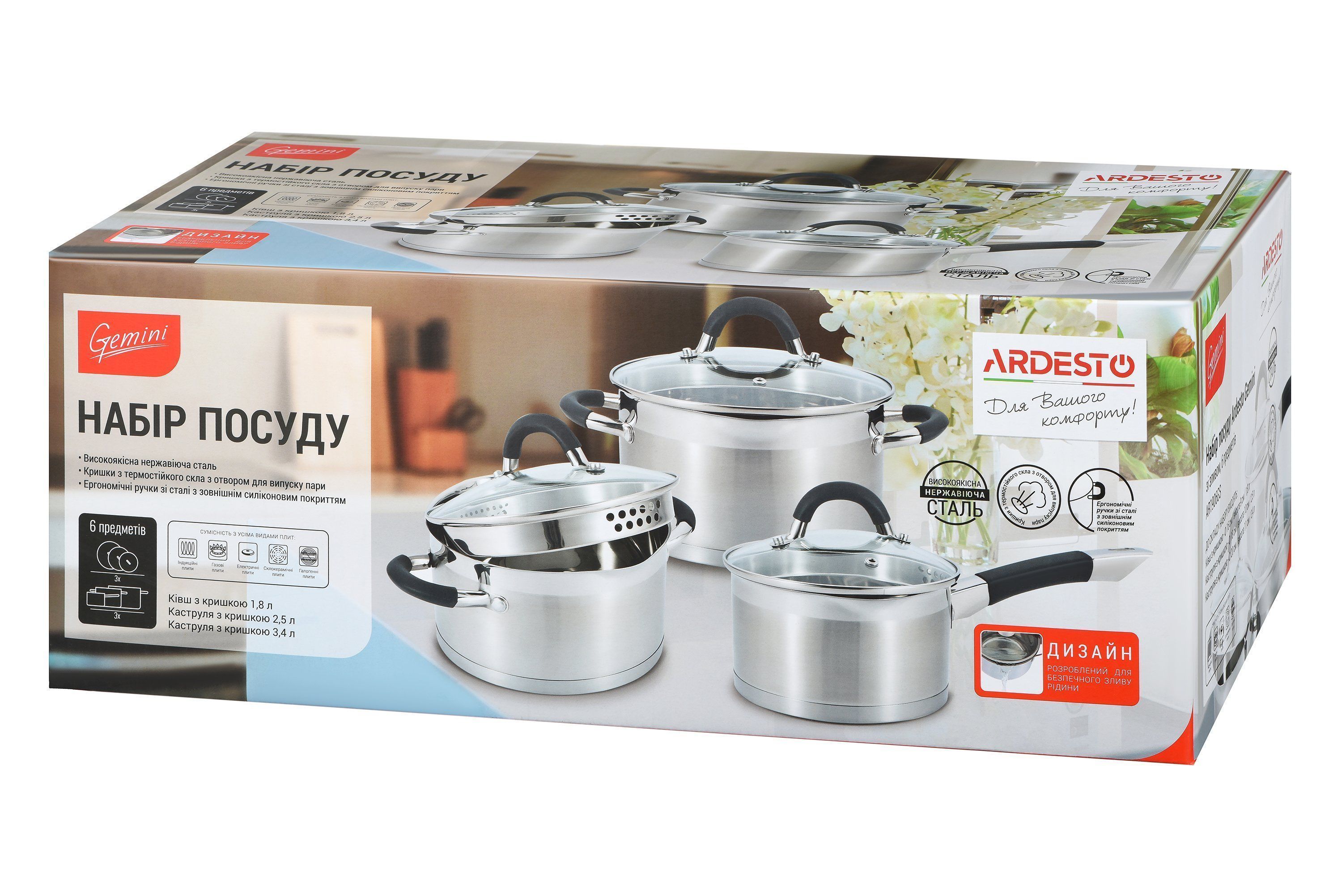 Набір посуду Ardesto Gemini Monza зі зливом, 6 пред., ручки з сірим силіконом, нержавіюча сталь