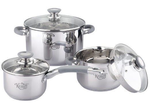 Набір посуду Krauff 26-238-021 складається із трьох каструль різного об'єму, укомплектованих кришками, а також підставки під гаряче.