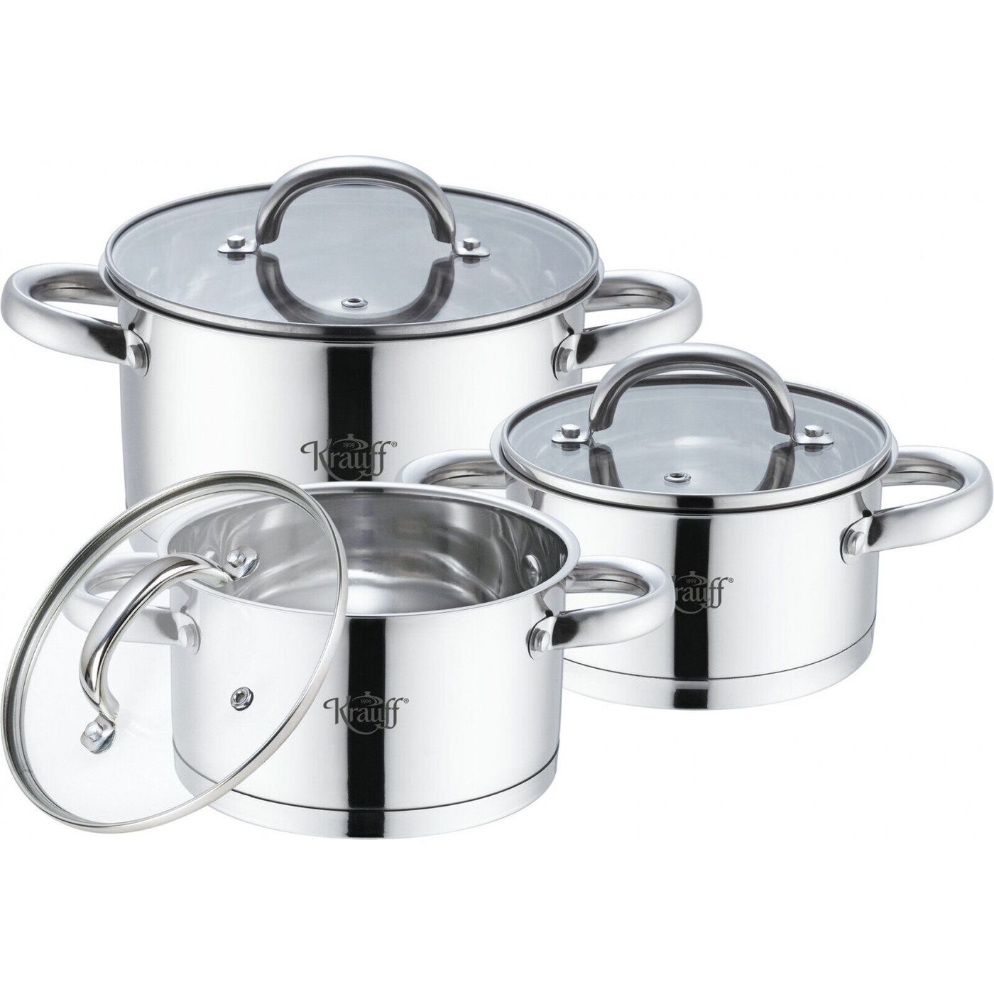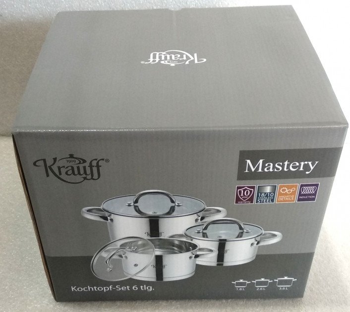 Набір посуду Krauff 26-242-043 складається із шести предметів, з них три каструлі, а решта трьох - кришки для них.