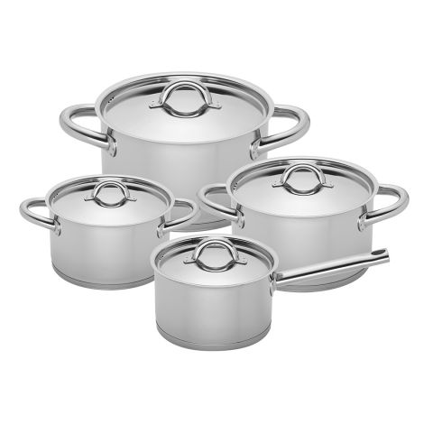 Набір посуду кухонного (4 предмети з 4 кришками) виготовлений із нержавіючої сталі.