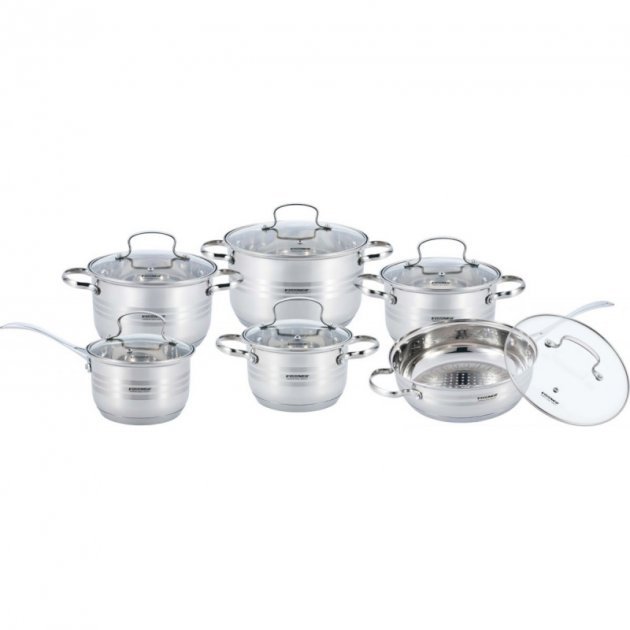 ківш із кришкою 2.1 л; каструля із кришкою 2.1 л; каструля із кришкою 2.9 л; каструля із кришкою 3.9 л; каструля із кришкою 6.6 л сковорода з кришкою D 24 см.Характеристики: