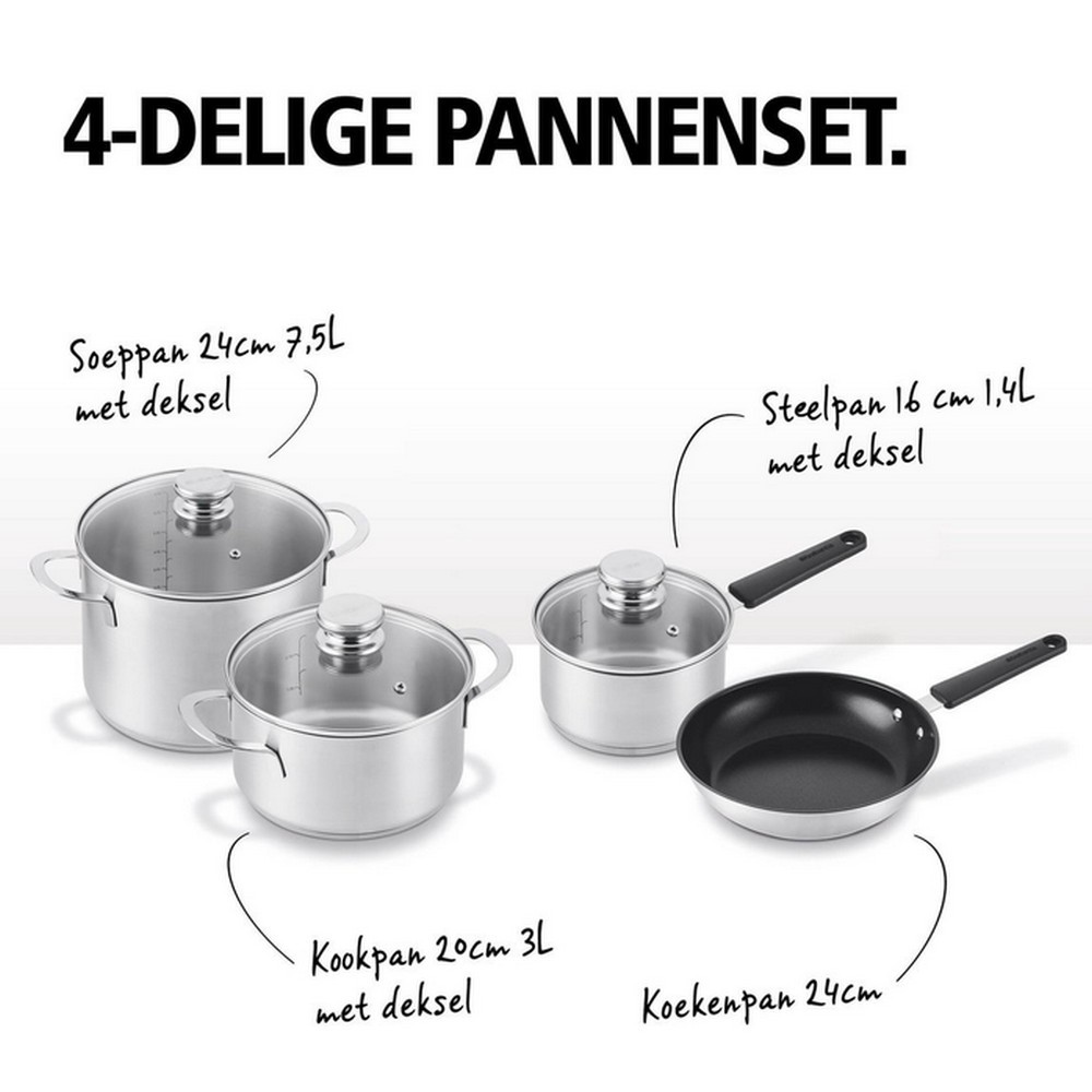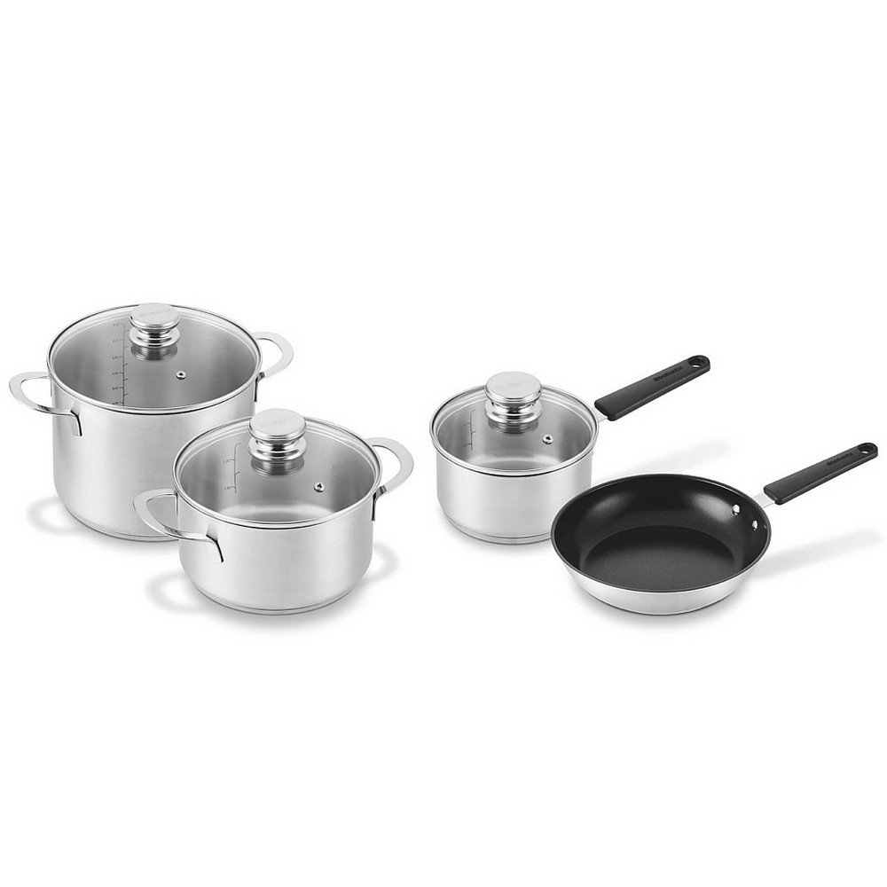 Комплектація: сотейник із кришкою 16 см 1,4 л; каструля із кришкою 20 см 2,8 л; каструля із кришкою 24 см 4,4 л; сковорода з антипригарним покриттям 24 див.
