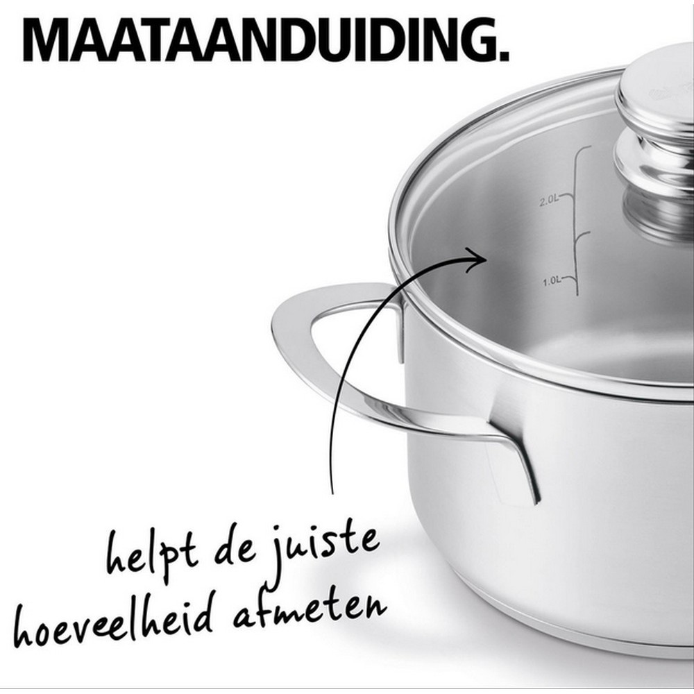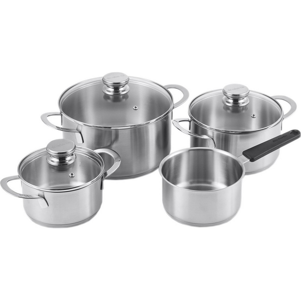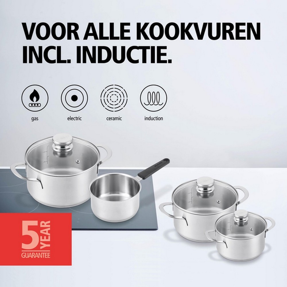 Комплектація: сотейник: 16 см – 1.6 л, каструля з кришкою: 16 см – 2 л, каструля з кришкою: 20 см – 3 л, каструля з кришкою: 24 см – 5.1 л.