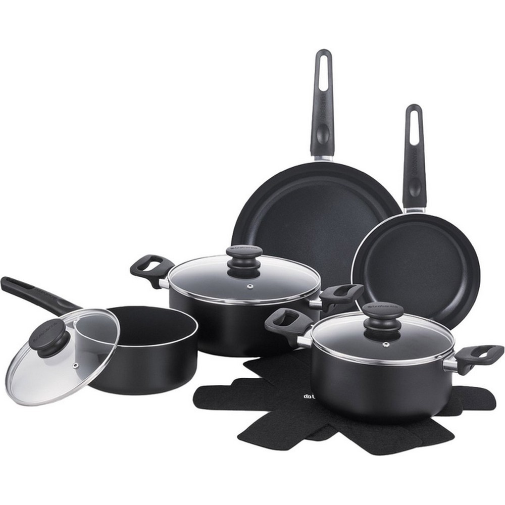 Комплектація: сотейник з кришкою 18 см 2 л, каструля з кришкою 20 см 2.5 л, каструля з кришкою 24 см 4.5 л, сковорода 20 см, сковорода 28 см + 2 захисні вкладиші для посуду