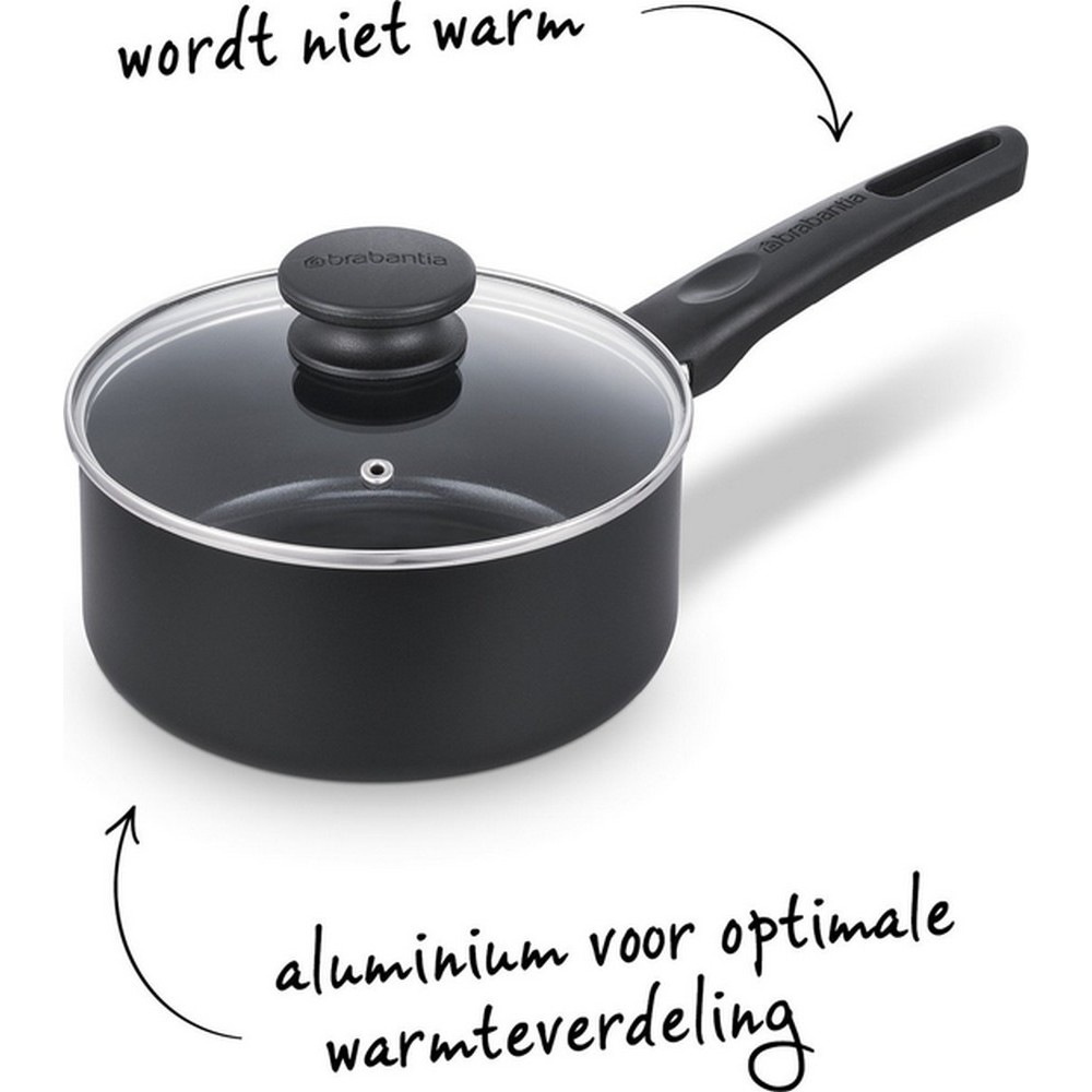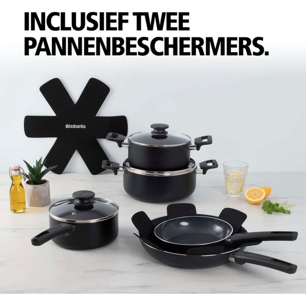 Набір посуду Brabantia Indu+ 8 предметів 30005095 виготовлений з алюмінію. У комплекті 8 предметів: сотейник з кришкою 18 см (2 л), каструля з кришкою 20 см (2,5 л), каструля з кришкою 24 см (4,5 л), сковорода 20 см, сковорода 28 см + 2 захисні вкладиші для посуду.