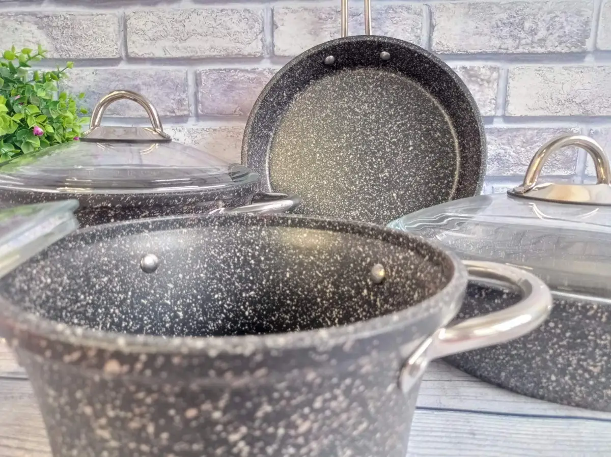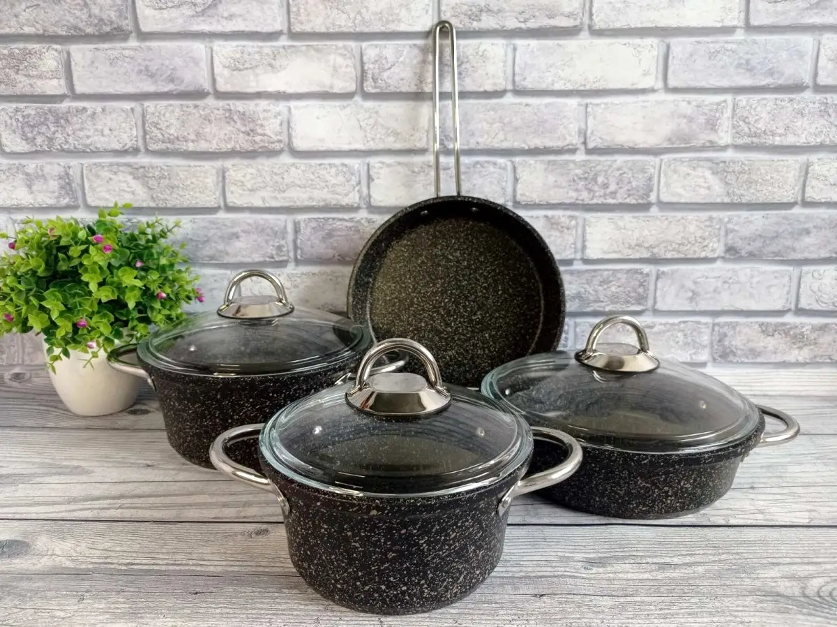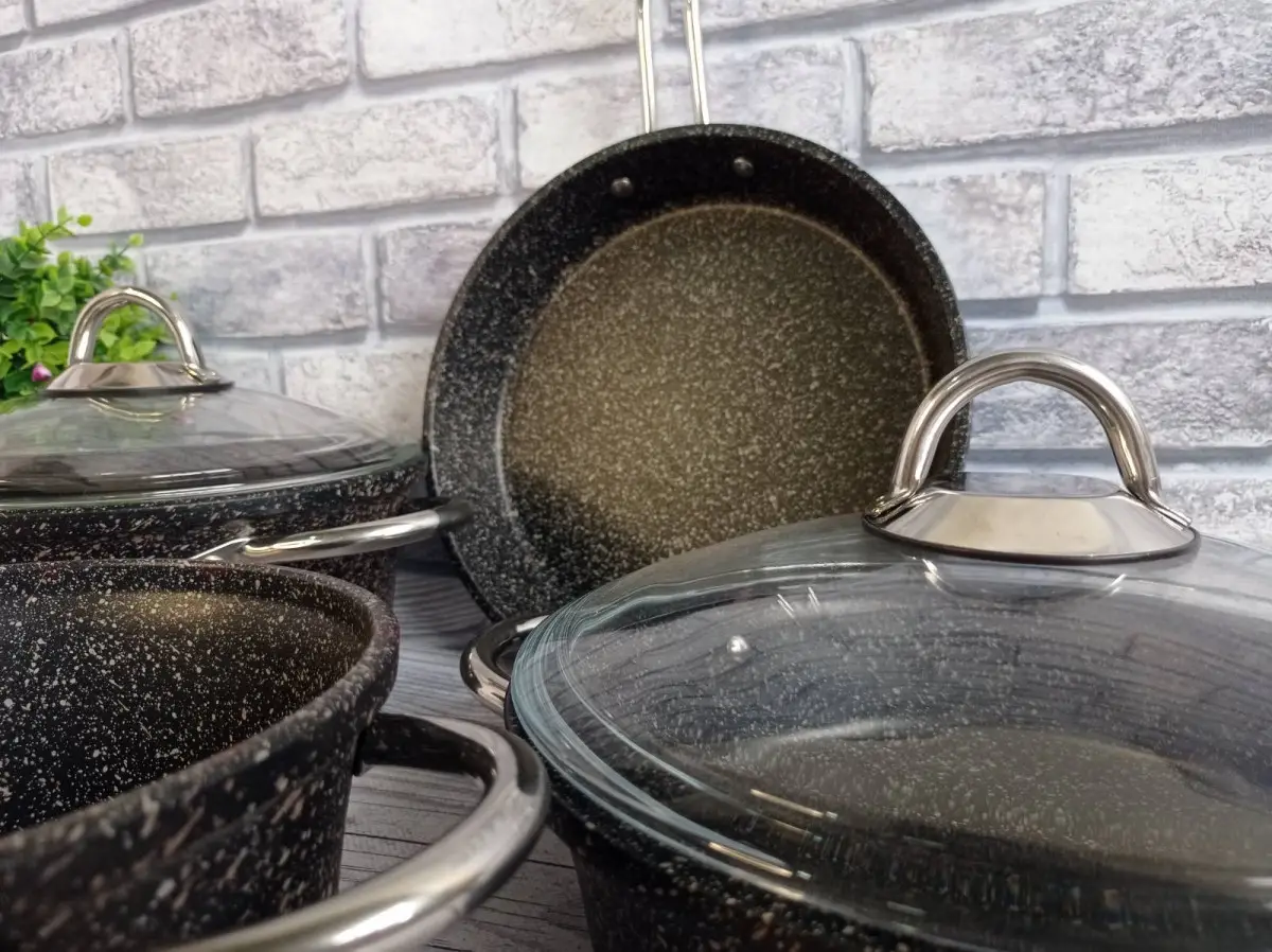 Набір посуду 7 предметів OMS 3048-Black 20Х10 см / 2,50 л. 24Х11,5см / 4 л. 26Х7,5 см / 3,3 л. СКОВОРОДА 26Х5,5 см / 2,3 л